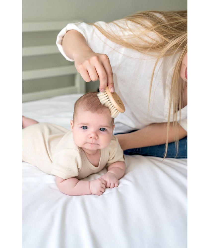 These two brushes are complementary. We know that usually both are needed. Delicate goat hair is useful for a gentle massage of head and body of a newborn and for combing the first delicate hair. The bristle brush, which is a bit harder, helps to remove cradle cap or easily comb thick hair.